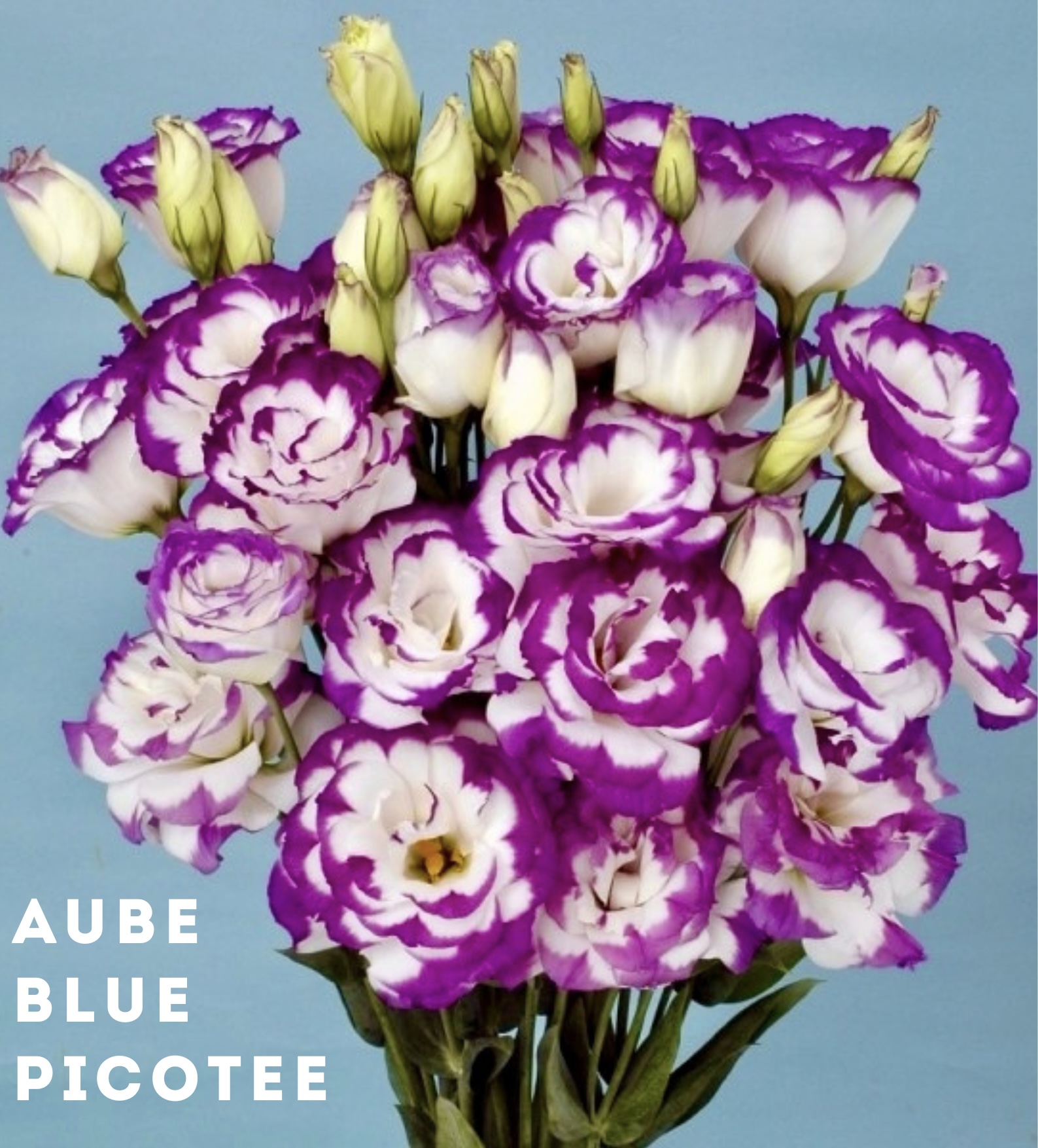 Эустома Echo Picotee Blue F1 — эффектный сорт лизиантуса с крупными густомахровыми белыми цветками с яркой темно-синей каймой, на прочных стеблях высотой до 70 см, отлично подходит для клумб и выращивания на срезку.