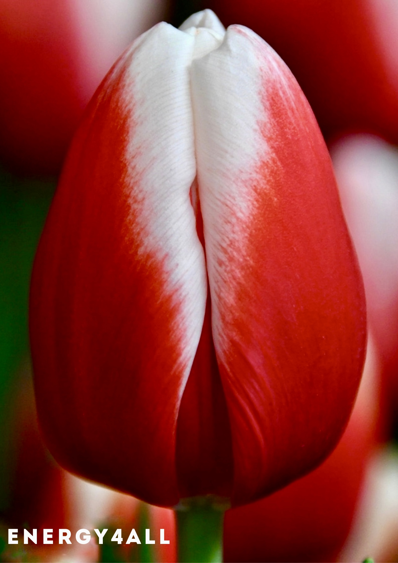 Тюльпан Energy4all — декоративный сорт группы Триумф с эффектными красно-белыми лепестками и классической формой бутона, отличается средним сроком цветения (EPW 47) и средней высотой растения; подходит для выгонки в воде и выращивания после обработки при 9 °C, отлично смотрится в весенних клумбах и букетах.