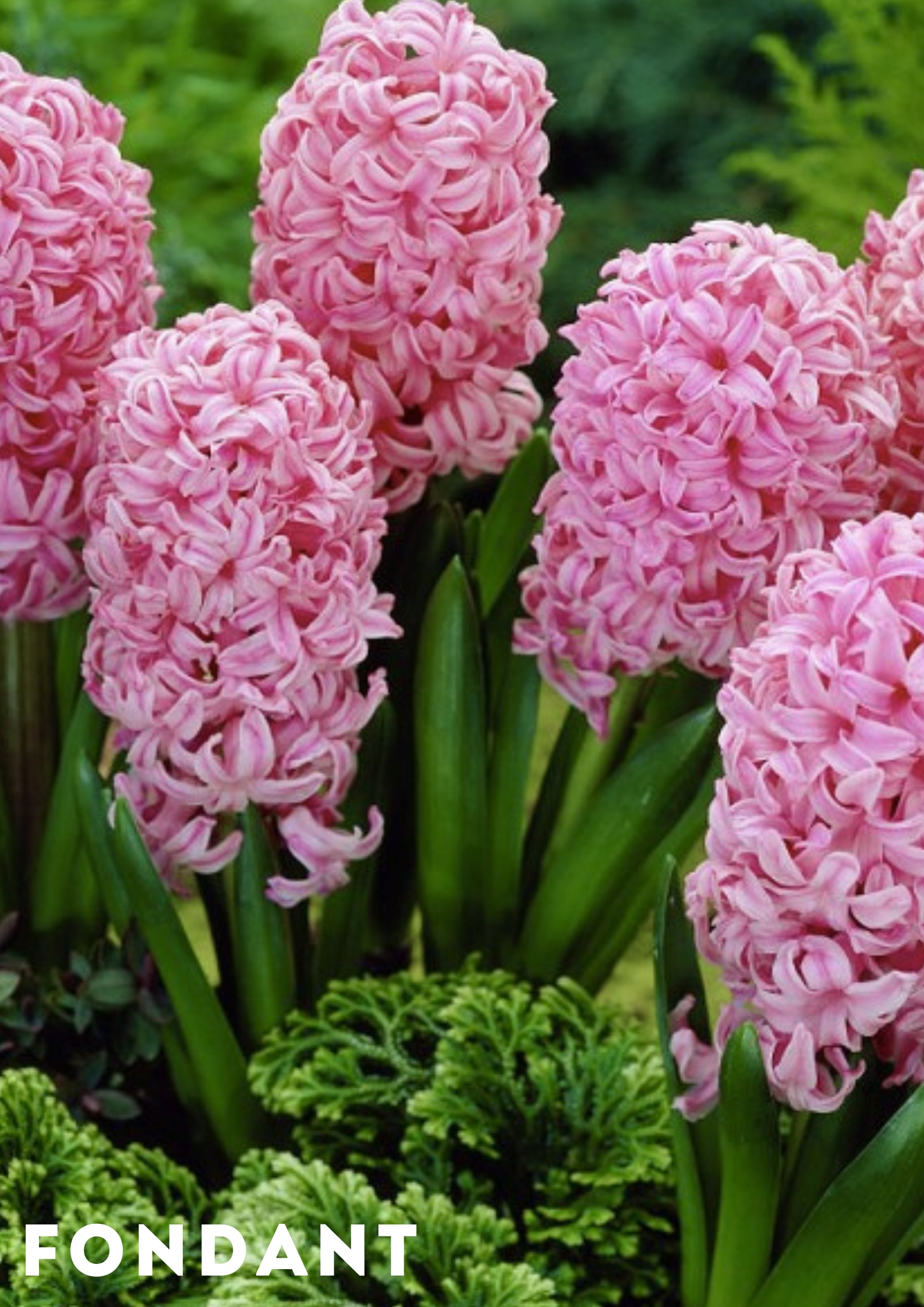 Гиацинт Fondant — популярный сорт группы Orientalis с нежными розовыми цветками и плотным ароматным соцветием на стебле около 25 см, отлично подходит для весенних клумб, контейнеров и декоративной выгонки.