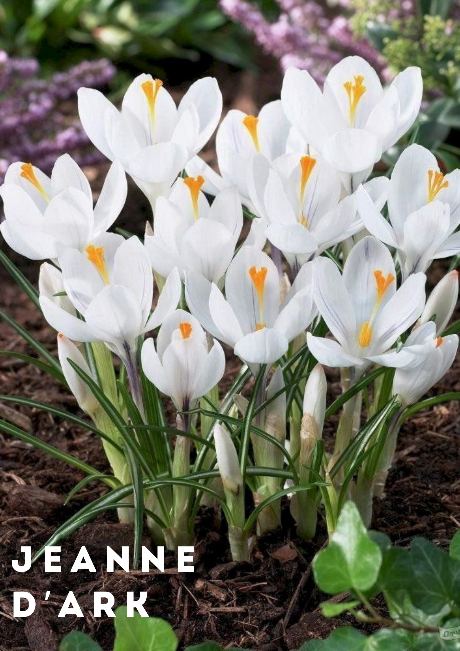 Крокус Jeanne d’Arc — элегантный сорт группы Vernus с крупными белыми цветками и яркой оранжевой серединой, один из первых украшает сад ранней весной и отлично подходит для клумб, газонов, альпийских горок и контейнерного выращивания.